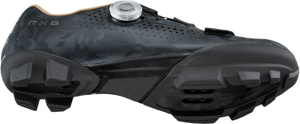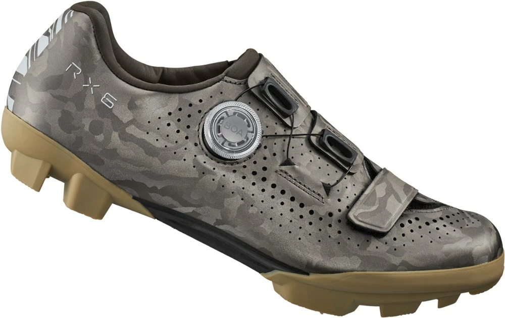 Optimally balanced for stiffness and walkability, the women’s Shimano RX 6 gravel bike shoes have carbon-reinforced soles that offer race-level rigidity for pedaling performance on day-long rides.